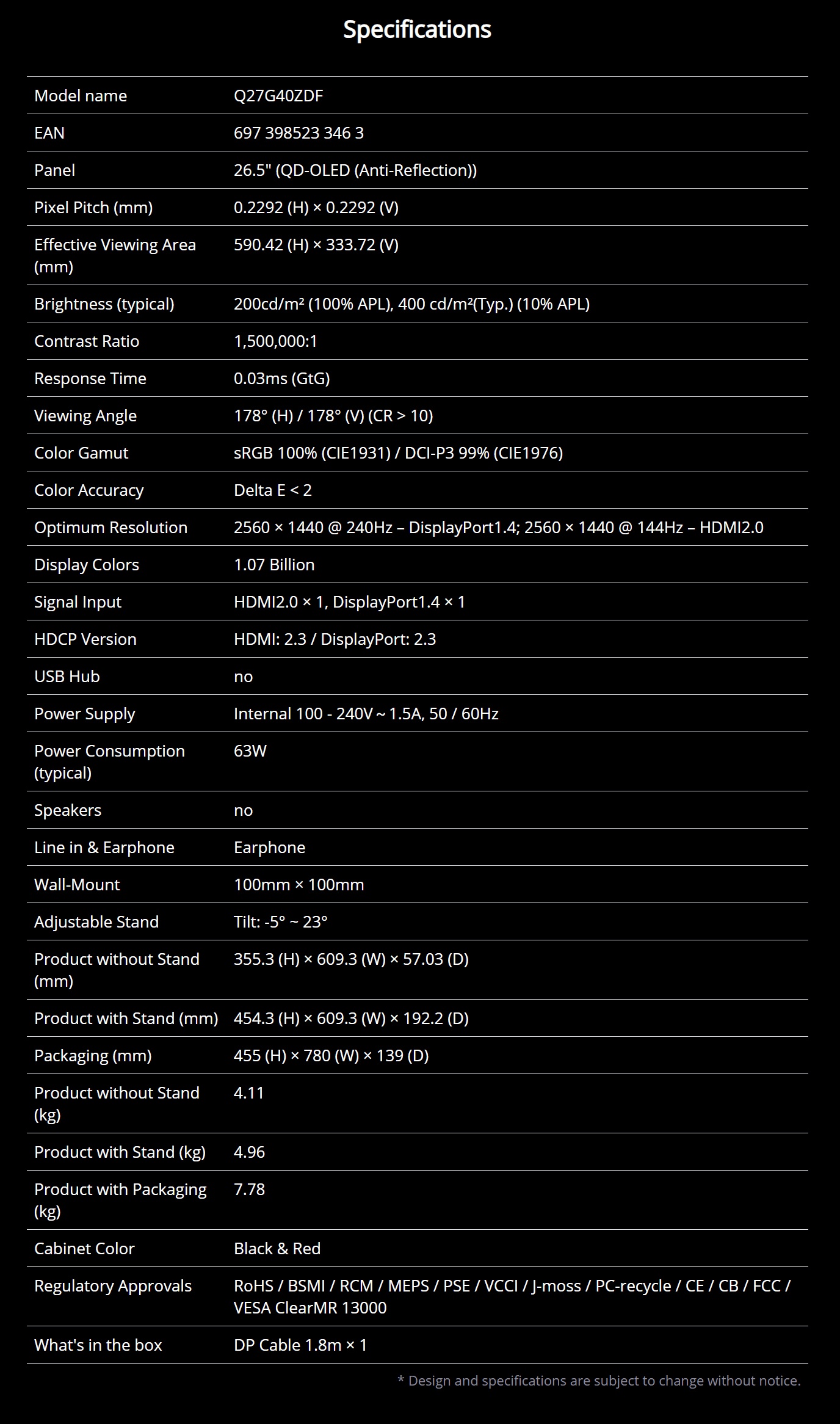 AOC Q27G40ZDF 27" QHD QD-OLED 240Hz AdaptiveSync Gaming Monitor
